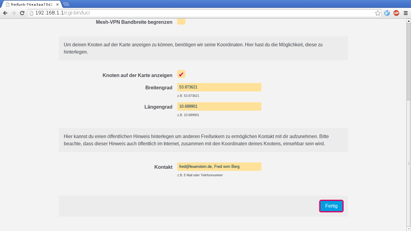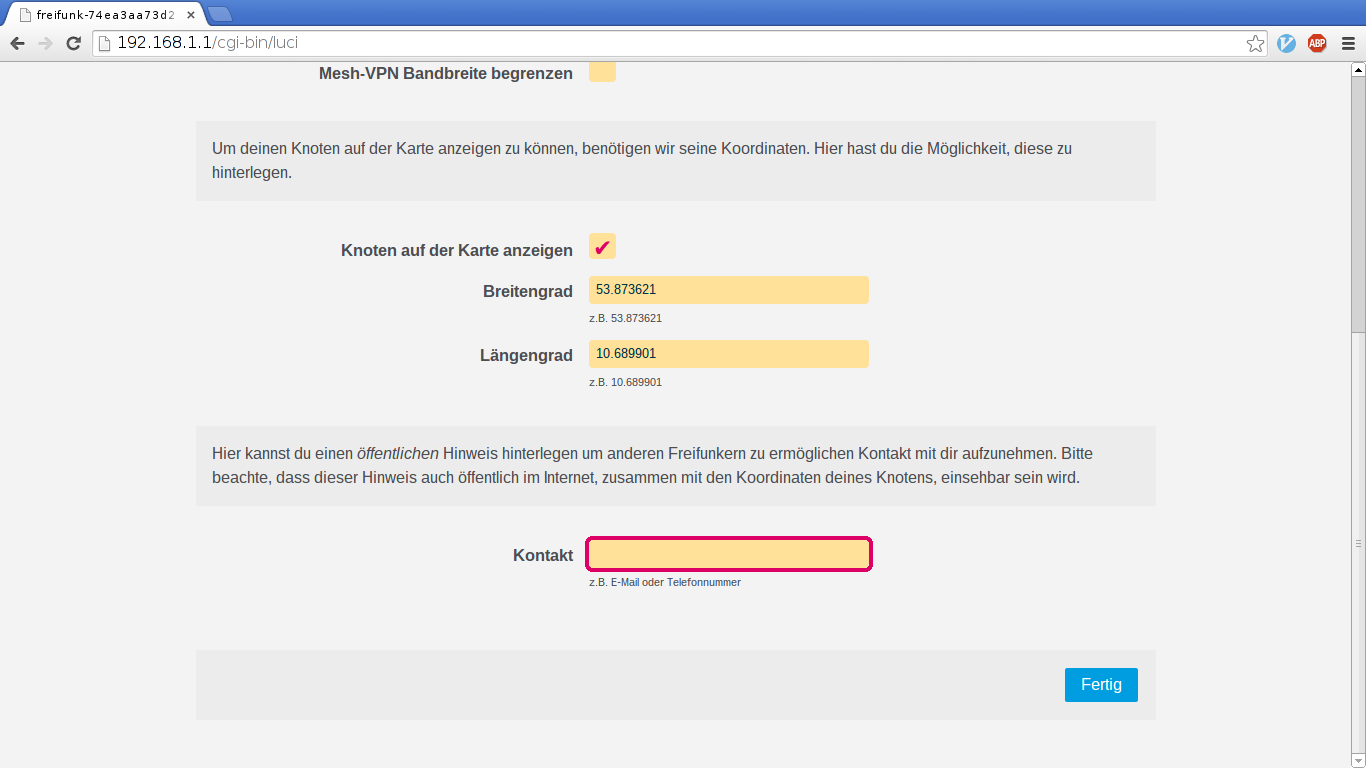 Um einen Knoten-Betreiber erreichen zu können, braucht die Gemeinschaft eine Kontakt-Möglichkeit. Du kannst dazu in diesem Feld beispielsweise eine E-Mail Adresse eintragen oder einen Namen, der dir von anderen aktiven Freifunker zugeordneten werden kann. Beachte, dass die Kontaktdaten, die du hier eingibts, öffentlich zugänglich sind. Wenn Du magst, kannst du hier mehrere Werte eintragen.Trenne diese bitte mit einem Komma. Wenn du unsicher bist, dann lass dieses Feld leer. Du kannst das später noch ändern.