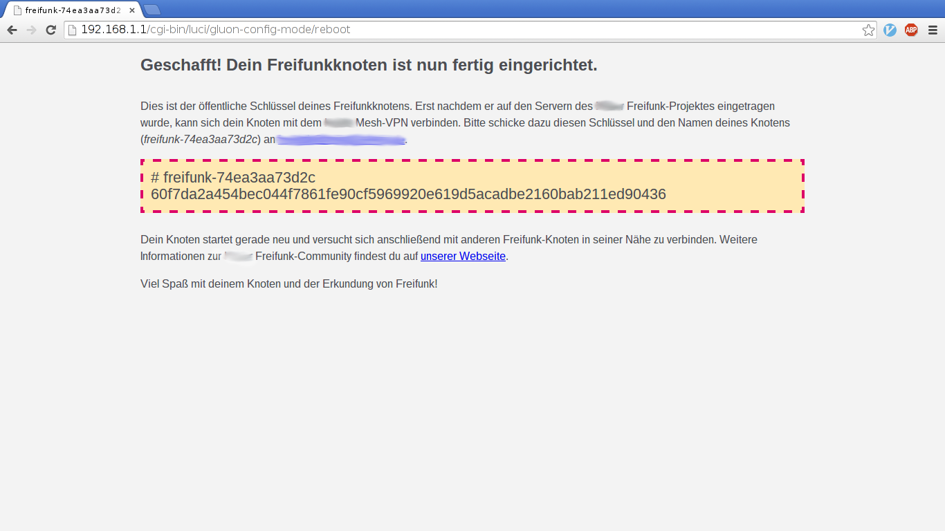 Die nun erscheinende Seite fasst zusammen, was du als nächstes tun solltest. Hast du in Schritt 4 das Mesh-VPN aktiviert, zeigt die Seite wie in der Abbildung einen eingerahmten Block an, welcher deinen Knoten Namen und einen VPN-Schlüssel enthält. Sende den Inhalt dieses Blocks an keys@ostholstein.freifunk.net.