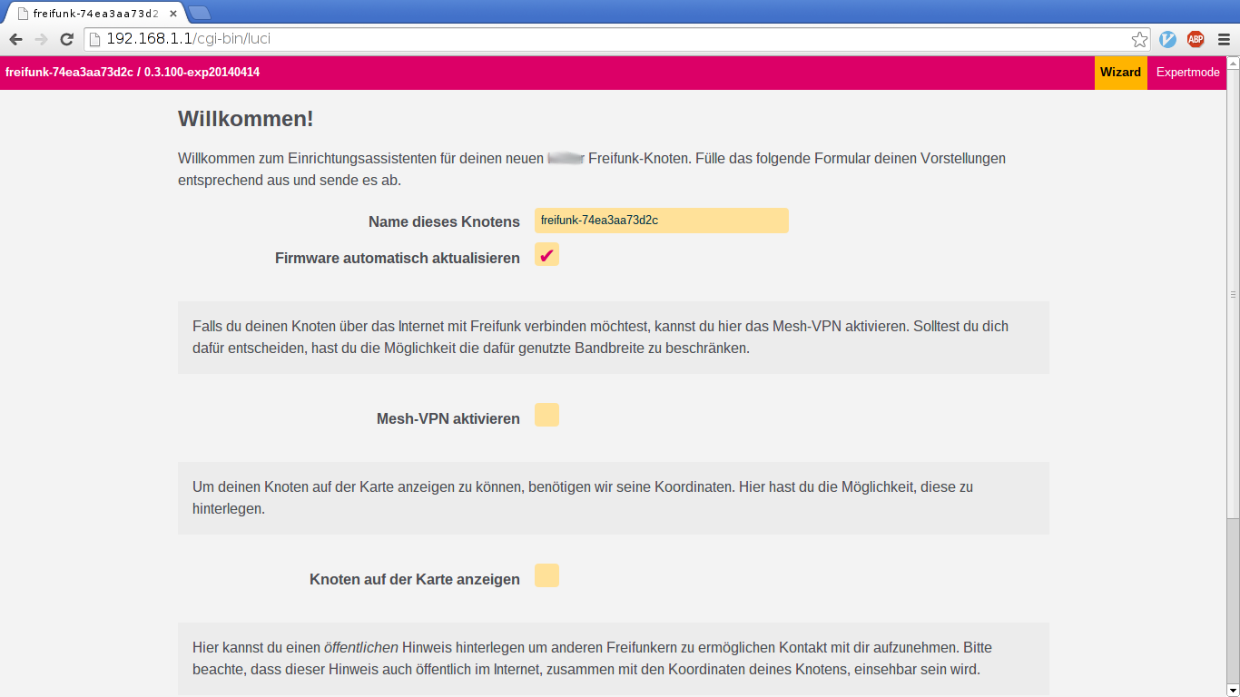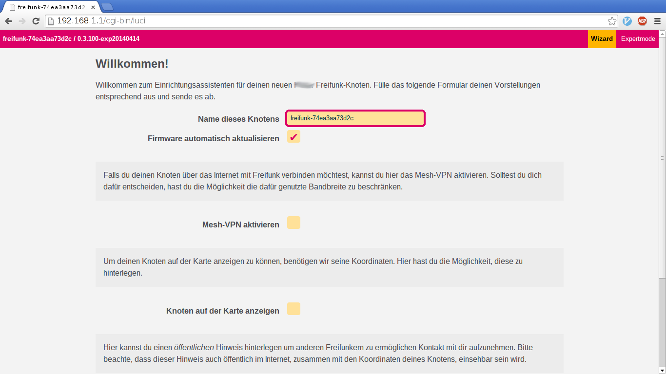 Jetzt kannst du den Knotenn über den Browser konfigurieren. Dazu rufst du in deinem Browser folgende Adresse auf: