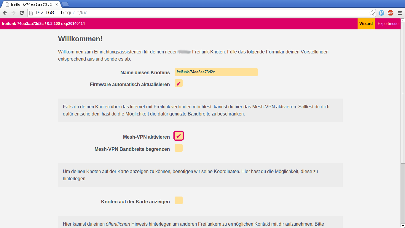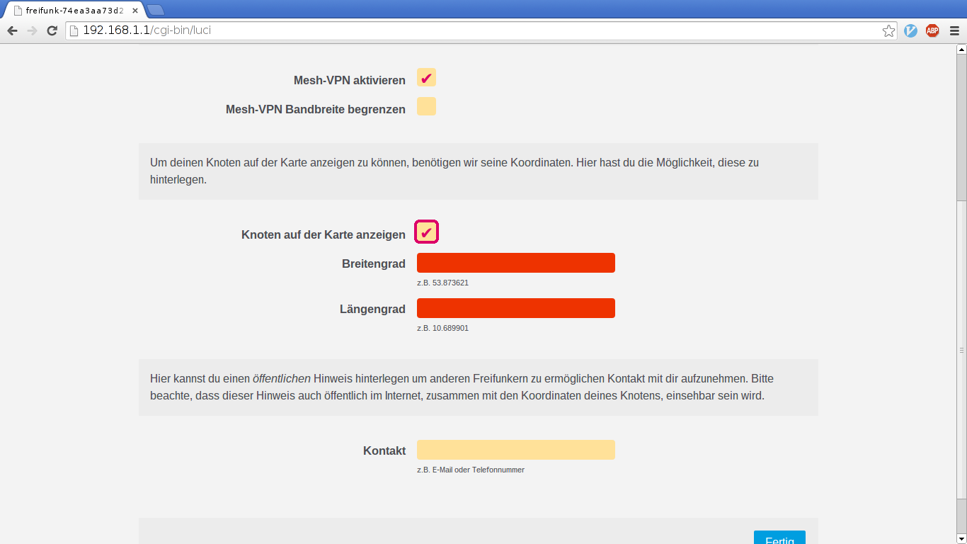 Wenn du möchtest, dass du und andere Mitmenschen den Standort deines Knotens in der Freifunk-Karte sehen können, dann musst du hier ein Häkchen setzen und die rot unterlegten Felder ausfüllen. Die Werte dazu kannst zum Beispiel mit Hilfe des Knopfes "Koordinaten beim nächsten Klick anzeigen" in der angesprochenen Karte ermitteln.